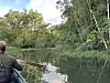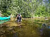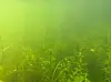 Stim av mort inne på grunt vann med mye vegetasjon. Grunnområdene er et rikt matfat for småfisk. Den grønne fargen i vannet skyldes planteplankton.(Foto: Carl Fredrik Brude og Gabriel Eggebø, NMBU.)
