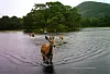Våryre hjortar som badar med badevakt! Hjorten badar gjerne heile sommarhalvåret for å reinske pelsen eller avkjøle seg, og kan gjerne ta seg ein svømmetur. Om hausten badar bukkane i brunstgroper.