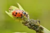 Men: Tilsett en håndfull marihøner og se hva som skjer med samspillet mellom artene. Når soyabønner, bladlus og marihøner fikk leve sammen uten musikk, gjorde marihønene jobben sin og jafset i seg bladlus, slik de gjør til vanlig i naturen. Det var knapt en bladlus å spore på testplantene. Det betød også at soyabønnene slapp å bli konstant årelatt av disse ivrige plantesaftsugende insektene, og plantene vokste seg store og sterke.