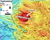 Skyggerelieff av havbunnen basert på terrengmodell med oppløsning 5 m mellom dybdepunktene. Den hvite pilen peker på Hjelmen, der vanndypet er ca. 165–210 meter. Furene på havbunn er isfjellpløyespor. De hvite sirklene merket a–l ligger langs transektet, og viser plassering av bildene a-l nedenfor. (Foto: MAREANO)