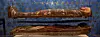 Da jeg løftet på dette svøpet så jeg at kroppen og de avrevne tekstilene var dekket med et rikelig dryss av noe som ligner grov sagflis, og mange flak av glassaktig, svart harpiks oppi det hele. Et stort, rødt tekstil som en gang svøpte inn den helbandasjerte mumien, lå krøllet halvveis under den, halvveis langs siden.